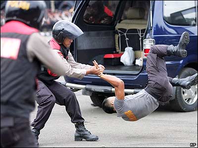 يک پليس اندونزی از واحد ضد تروريست در حال تمرين آموزش های مخصوص برای دستگير کردن افراد مظنون به اقدامات تروريستی در شهر جاکارتا.