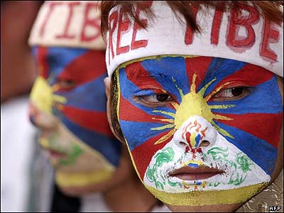 گروهی از تبتی های مهاجر که صورتشان را به شکل پرچم کشورشان نقاشی کردند، در شهر درمسلا، شمال هند، در چهل و هفتمين سالگرد قيام تبتی ها عليه سلطه چين تجمع کردند.