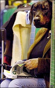سگی از نژاد دوبرمن آلمانی در کنار صاحبش در نمايش ساليانه سگ که در بيرمنگهام بريتانيا برگزار می گردد...