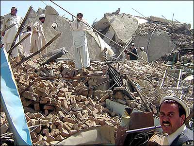 مردانی که دکانهايشان در اثر زد و خورد شدید میان نیروهای پاکستانی و پيکارجويان اسلامگرا در منطقه ای وزیرستان شمالی ویران شده است، در ميان آوار، باقی مانده متعلقات شان را جستجو می کنند.