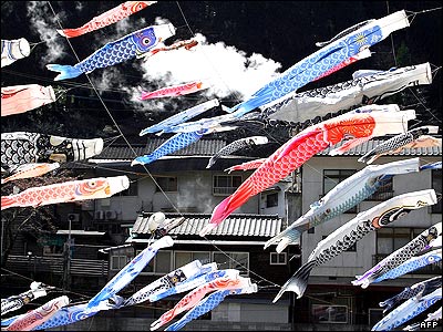 نوارهای رنگی به شکل ماهی کپور که خيابان های ژاپن را تزئين کرده است. اين نوارها به مناسبت روز جهانی کودک که به تاريخ پنجم آوريل دراين کشوربرگزارمی شود، در خيابان ها گذاشته شده است.