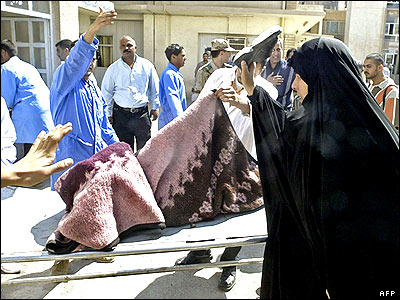 يک زن عراقی در حاليکه با کفشش جسد يک بمب گذار انتحاری را می زند. بمبی در نزديکی يک قرارگاه پليس در غرب بغداد منفجر شد که چهار تن زخمی به جا گذاشت