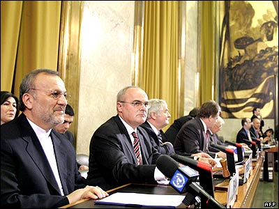 منوچهر متکی در حال سخنرانی در سازمان ملل متحد. وزير امور خارجه ايران بيانيه شورای امنيت را در مورد برنامه هسته ای ايران محکوم و طرح جديدی را برای حل بحران کنونی پيشنهاد کرد.