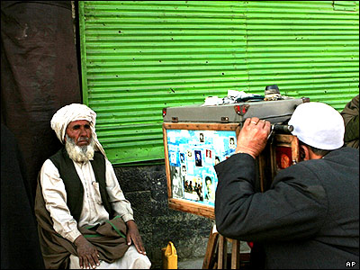 يک عکاس افغان در يکی از خيابان های کابل در حال عکس گرفتن با يک جعبه عکاسی قديمی.