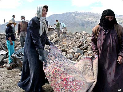 زنان ايرانی در حال بيرون آوردن اثاثيه هايشان از زير آوار در بروجرد