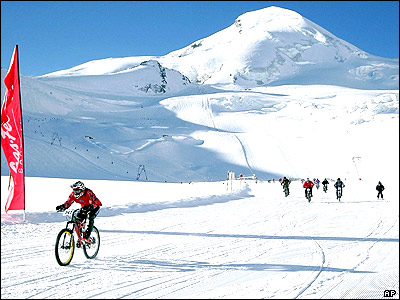 صحنه ای از مسابقه دو چرخه سواری روی پيست يخی در سويس
