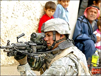 يک سرباز آمريکايی در شهر تل عفر در شمال عراق مشغول مراقبتهای امنيتی در خيابان. کاندوليزا رايس، وزير امور خارجه آمريکا و جک استرا، همتای بريتانيايی او در يک سفر غير منتظره، برای گفتگو با رهبران عراق وارد اين کشور شده اند