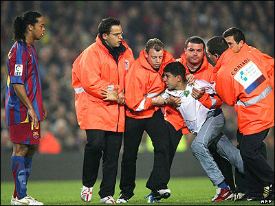 يکی از طرفداران مراکشی تيم فوتبال بارسلونا که وارد ميدان بازی شده است، توسط نيروهای امنيتی به بيرون از ميدان برده می شود. |