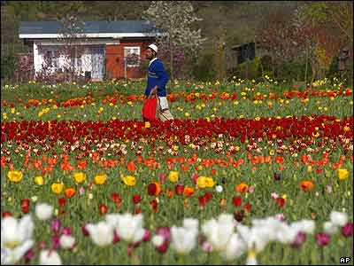 رهگذری از ميان باغ گل لاله در شهر سريناگار در هند می گذرد. گزارش ها از هند حاکی است که صنعت باغبانی در کشمير درآمدی معادل 10 ميليون دلار توليد کرده است.