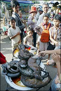 شهروندان پنوم پنه، پايتخت کامبوج، در حال نگاه کردن به حيواناتی از جمله مار، مارمولک، لاک پشت و غيره که در حال پخته شدن روی گاز هستند. اين يک روش سنتی برای تهيه داروست. |