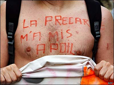 در جريان اعتراضات سراسری در فرانسه در مخالفت با قانون جديد کار، يکی از معترضين روی سينه اش نوشته: "از فرط ناامنی شغلی، لخت و برهنه مانده ام."