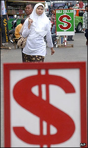 يک زن مسلمان اندونزی از کنار علامت های دلار که نشانی است برای جلب توجه مردم به صرافی های غيرقانونی در خيابان های شهر جاکارتا، پايتخت اندونزی. نرخ روپيه اندونزی در مقابل دلار آمريکا اخيرا بالا رفته است.