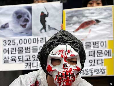 يک طرفدار محيط زيست در شهر سئول، پايتخت کره جنوبی در تظاهراتی بر عليه موضوع جنجال آميز کشتار شيردريايی در کانادا.