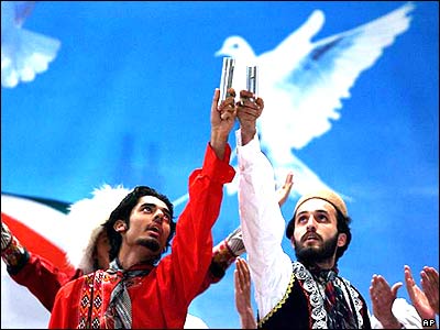 جوانان ايرانی در حال اجرای رقص نمايشی در شهر مشهد، در حاليکه کپسولی حاوی هگزافلوئوريد اورانيوم را در دست دارند .