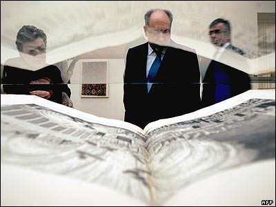 اميليو روی ويلار، رئيس بنياد "کالوست گولبنکيان" ليسبون پرتغال، در حال بازديد از موزه سابانچی در شهر استانبول در جريان نمايشگاه "هنر کتاب از شرق تا غرب و يادی از امپراطوری عثمانی". در اين نمايشگاه حدود 75 کتاب و نسخه خطی نادر و برجسته برای ديد عموم به نمايش درآمد. |
