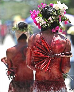 فيليپينيهايی که در جريان يک مراسم مذهبی در روستای "سن پدرو کوتود" در اطراف مانيل خود را با شلاق می زنند. حداقل هفت زاهد فيليپينی به اميد بخشيده شدن گناهانشان خود را در اين روستا به صليب ميخکوب کردند.