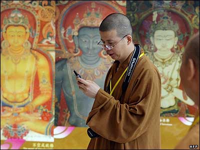 يک راهب بودايی چينی در حال بررسی تلفن همراه خود در جريان اجلاس جهانی آيين بودايی در شهر هانگژو. از سال ۱۹۴۹ تا کنون اين نخستين بار است که حکومت کومونيستی چين اقدام به برگزاری يک اجلاس بين المللی در مورد آيين بودايی می کند.