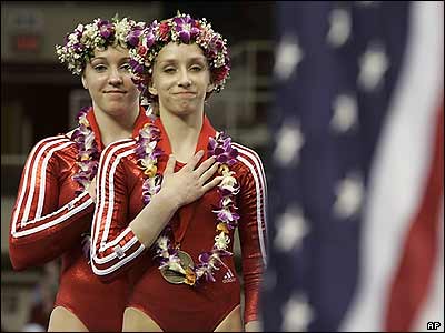 دو ورزشکار آمريکايی در حال گوش دادن به سرود ملی کشورشان در جريان مسابقات ژيمناستيک اتحاد پاسيفيک در هونولولو.