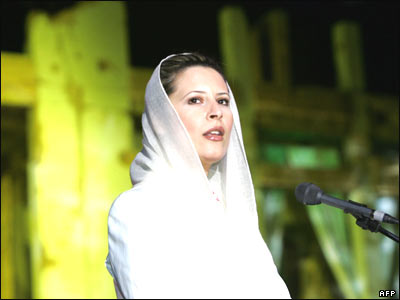 عايشه قذافی دخترسرهنگ معمر قذافی، رهبر ليبی، در حال سخنرانی در کنسرتی که به مناسبت بيستمين سالگرد بمباران شهر های طرابلس و بن غازی در آن کشور برگزار شده بود. لاينل ريچی خواننده پاپ آمريکايی در اين کنسرت آواز خواند.