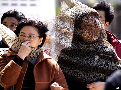 زنان چينی در گير توفان شن. از ابتدای سال جاری ميلادی بارها در پکن توفان شن آمده است.