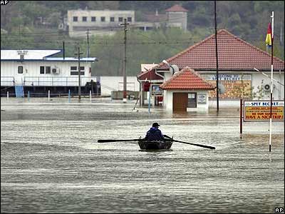مردی سوار بر قايق، در منطقه سيل زده بيکت واقع در مرز رومانی و بلغارستان.