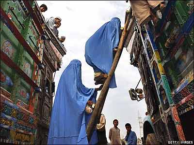 پناهندگان زن افغان در حال سوار شدن به کاميونی که قرار است آنان را از اردوگاهی در پيشاور پاکستان به کشورشان افغانستان بازگرداند.