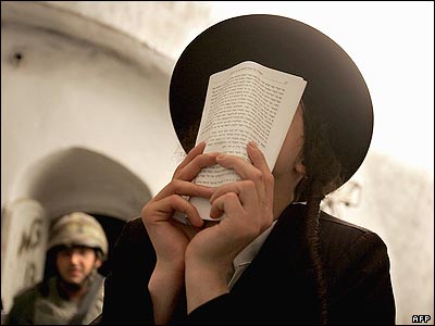 يک اسرائيلی ارتودوکس در حال دعا کردن در کنار قبر کالب بن يفونه، يکی از اولياء بنی اسرائيل. آن گونه که در تورات آمده، حضرت موسی او را همرا با يازده تن ديگر به سرزمين کنعان (فلسطين کنونی) فرستاد تا درباره اين سرزمين برای او خبر جمع کند.