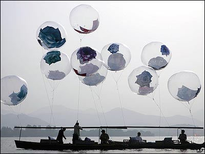 ده بالون بزرگ با رنگ آميزی و نقاشی گل بعنوان کار هنری در شهر هانگ چو در چين. در آستانه روز اول مه، روز کارگر مراسم گسترده ای برگزار خواهد شد.