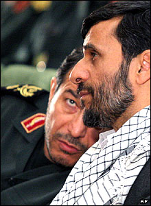 محمود احمدی نژاد رئيس جمهور ايران و مصطفی محمد نجار وزيرفاع در گردهم آيی نيروهای مقاومت بسيج. ایران موضع خود را در منازعه بر سر برنامه هسته ای اش سخت تر کرده است. این اقدام پس از آن صورت گرفت که کشورهای غربی طرحی را ارائه کردند که می تواند به تحریم های سازمان ملل متحد علیه ایران منجر شود.