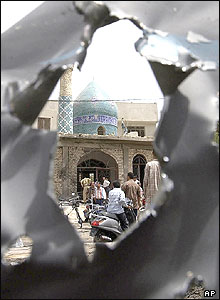 نمای مسجد شيعيان در کربلا از ميان لاشه خودرويی که در آن بمب کار گذاشته شده بود. در اثر يک رشته انفجار بمب در بغداد و کربلا بيش از 14 نفر کشته و عده ای مجروح شده اند.