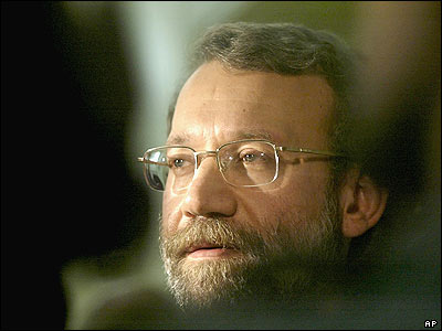 علی لاريجانی، دبير شورای عالی امنيت ملی و سرپرست مذاکرات هسته ای جمهوری اسلامی، پس از گفتگو با "درا بکويانيس"، وزير خارجه يونان. علی لاريجانی حل مسالمت آميز بحران اتمی ايران را امکانپذير دانسته و از طرح روسيه در اين زمينه حمايت کرده است.
