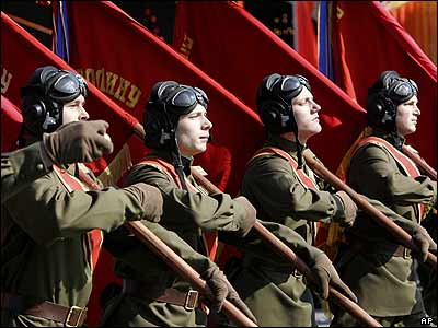 سربازان ارتش روسيه در يونيفورم های ارتش سرخ دوران جنگ جهانی دوم به مناسبت مراسم سالانه پيروزی روسيه بر آلمان نازی در ميدان سرخ مسکو رژه می روند.