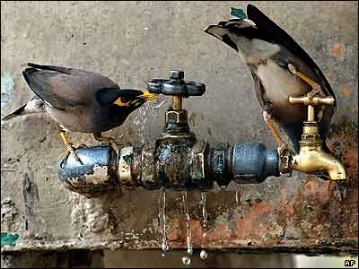 دو بلبل در حال فرو نشاندن تشنگی شان از شير آب در شهر اسلام آباد، پايتخت پاکستان. گفته می شود که دمای هوای اين شهر به ۴۱ درجه سانتی گراد رسيده است. |