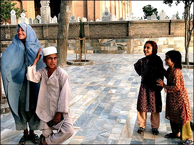 يک پسر افغان در آرامگاه خواجه عبدالله انصاری در هرات، افغانستان، برقع، پوشش مخصوص زنان افغان را به شوخی بر سر کرده است.