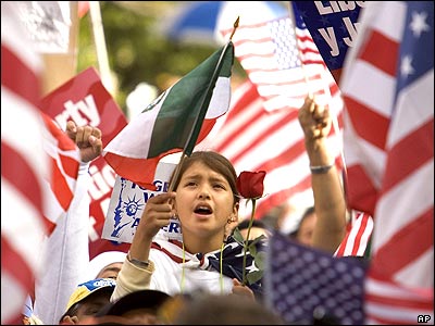مهاجران مکزيکی در اعتراض به بندهايی از يک لايحه مجلس سنا که اشتغال بدون مجوز در آمريکا را جرم به حساب می آورد، در شهر لس آنجلس به راهپيمايی پرداختند.