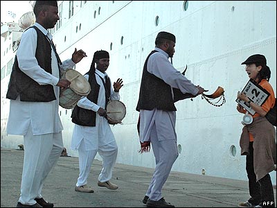 گروهی از نوازنده های يک گروه موسيقی ليبيايی در بندری در طرابس از يک گروه از فعالان طرفدار صلح استقبال می کنند. اين فعالان که ژاپنی هستند، به قصد پيشبرد صلح جهانی به ليبی سفر کرده اند.
