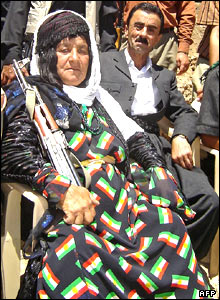 يک زن جنگجوی کرد جاف تبار در درشمال عراق.هزاران نفر از بی خانمانان کرد عراق که در جنگ سال های 1980 ايران و عراق آواره شده اند از سازمان ملل متحد خواسته اند که زمينه بازگشتشان را به ايران فراهم کند. اين آوارگان در اردوگاهی در شهر اربيل عراق زندگی می کنند.