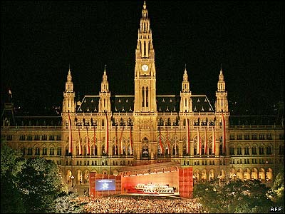 هزاران تن از علاقمندان برای شرکت در مراسم افتتاحيه جشنواره سالانه وين، در مقابل تالار شهرداری اين شهر گردهم آمده اند. در جشنواره وين هرسال کنسرت های متعددی در فضای آزاد بر گزار می شود.