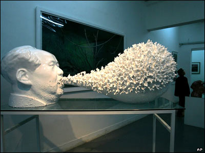 مجسمه مائوتسه تونگ از رهبران سابق چين، اثر 'ماه هان' هنرمند چينی. گفته می شود که آثار عده ای از هنرمندان به دليل حساسيت های سياسی توسط دولت چين سانسور شده و از نمايش باز مانده است. بسياری از هنرمندان معاصر چينی برای خلق آثار خود از انقلاب فرهنگی چين الهام می گيرند که اين هفته مراسم چهلمين سالگرد آغاز آن در اين کشور برگزار می شود.