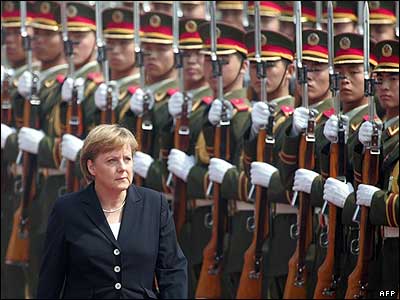 آنگلا مرکل، صدر اعظم آلمان، در مراسم رسمی ورود او به چين در ميدان تالار بزرگ مردم در شهر پکن، پايتخت آن کشور.
