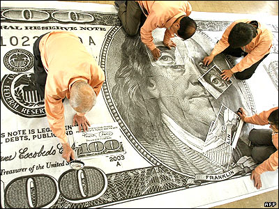 کارگران متخصص ژاپنی در حال مقايسه قسمت هايی از يک اسکناس جعلی صد دلاری با يک اسکناس صد دلاری رايج که چهارصد بار بزرگتر شده است. اسکناس های جعلی که در کره شمالی ساخته شده اند به اين وسيله شناسايی می شوند.