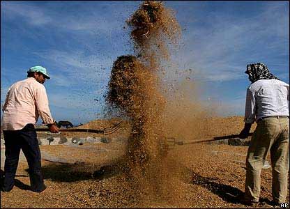 روستاييان يونانی در حال درو کردن و برداشت لوبيا در يکی از کشتزارهای جزيره سانتورينی واقع در دريای اژه. |