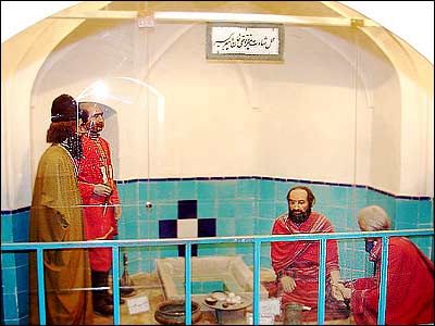 صحنه قتل امير کبير در حمام فين؛ اميرکبير در گرمخانه اين حمام و درکنار حوض مرمرينی که در ميان گرمخانه وجود دارد به قتل رسيد...