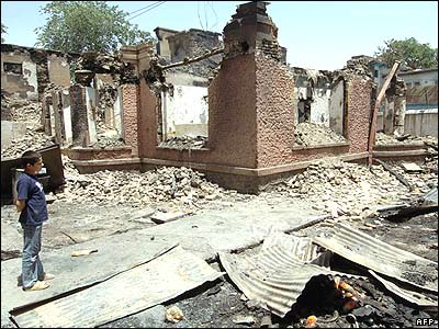 پسرک افغان در حال تماشای يک رستوران چينی ويران شده در کابل. مقامات نظامي آمريکا تاييد کرده اند که سربازان آنها در جريان حوادث خشونت آميز روز دوشنبه در کابل، "به منظور دفاع از خود مجبور به تيراندازی هوايی شده اند".