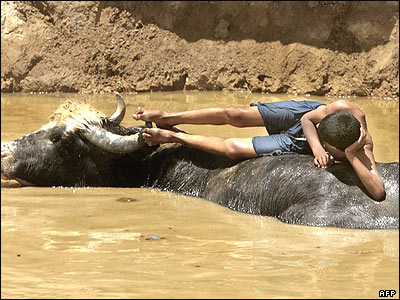 پسرک عراقی سوار بر گاوميش در رودخانه دياله در شرق بغداد.دمای هوا در بغداد به چهل درجه سانتی گراد رسيده است در حالی که مردم اين شهر همچنان با کمبود برق ، نفت و ديگر نيازمنيهای اوليه مواجه هستند.