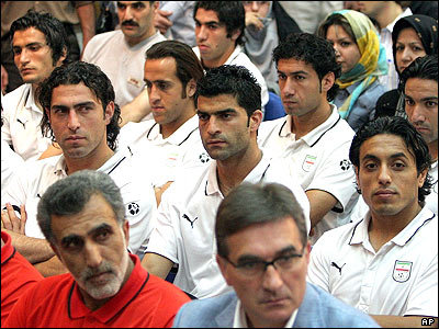 اعضای تيم ملی فوتبال ايران در مراسمی که به افتخار اين تيم در تهران برگزار شد. تيم ايران در دور مقدماتی مسابقات جام جهانی 2006 آلمان با تيمهای مکزيک، آنگولا، پرتغال بازی خواهد کرد.