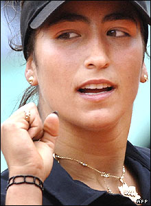 ارغوان رضايی تنيس باز فرانسوی ايرانی تبار، شادمان از پيروزی در برابر رقيب زاپنی اش در مسابقات تنيس آزاد فرانسه. خانم رضايی در تصوير گردنبندی با طرح نقشه ايران بر گردن دارد.