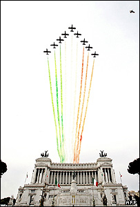 واحد ويژه نيروی هوايی ايتاليا موسوم به "پيکانهای سه رنگ" در جريان مراسمی به مناسبت شصتمين سالگرد تاسيس حکومت جمهوری در ايتاليا، پرچم اين کشور را با دود در آسمان ترسيم می کنند. |