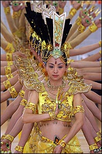 تای ليهوا رقصنده چينی به اتفاق 21 رقصنده کر و لال چينی، رقص موسوم به "الهه رحمت بخش هزار دست" را در پکن، پايتخت اين کشور تمرين می کنند.
