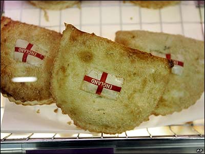 چند کلوچه سيب که روی آنها با طرح پرچم انگلستان تزئين شده است. اين کار در لندن برای نشان دادن پشتيبانی از تيم فوتبال انگلستان در مسابقات جام جهانی در آلمان، صورت گرفته است.